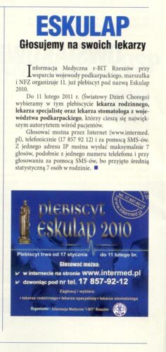 Informacja Medyczna r-BIT Rzeszów przy wsparciu wojewody podkarpackiego, marszałka i NFZ, zorganizowała XI Plebiscyt „Eskulap 2010” województwa podkarpackiego, którego celem był wybór lekarzy cieszących się największym autorytetem wśród pacjentów. Plebiscyt trwał do 11 lutego 2011 roku i został rozstrzygnięty w dniu 23 lutego br.